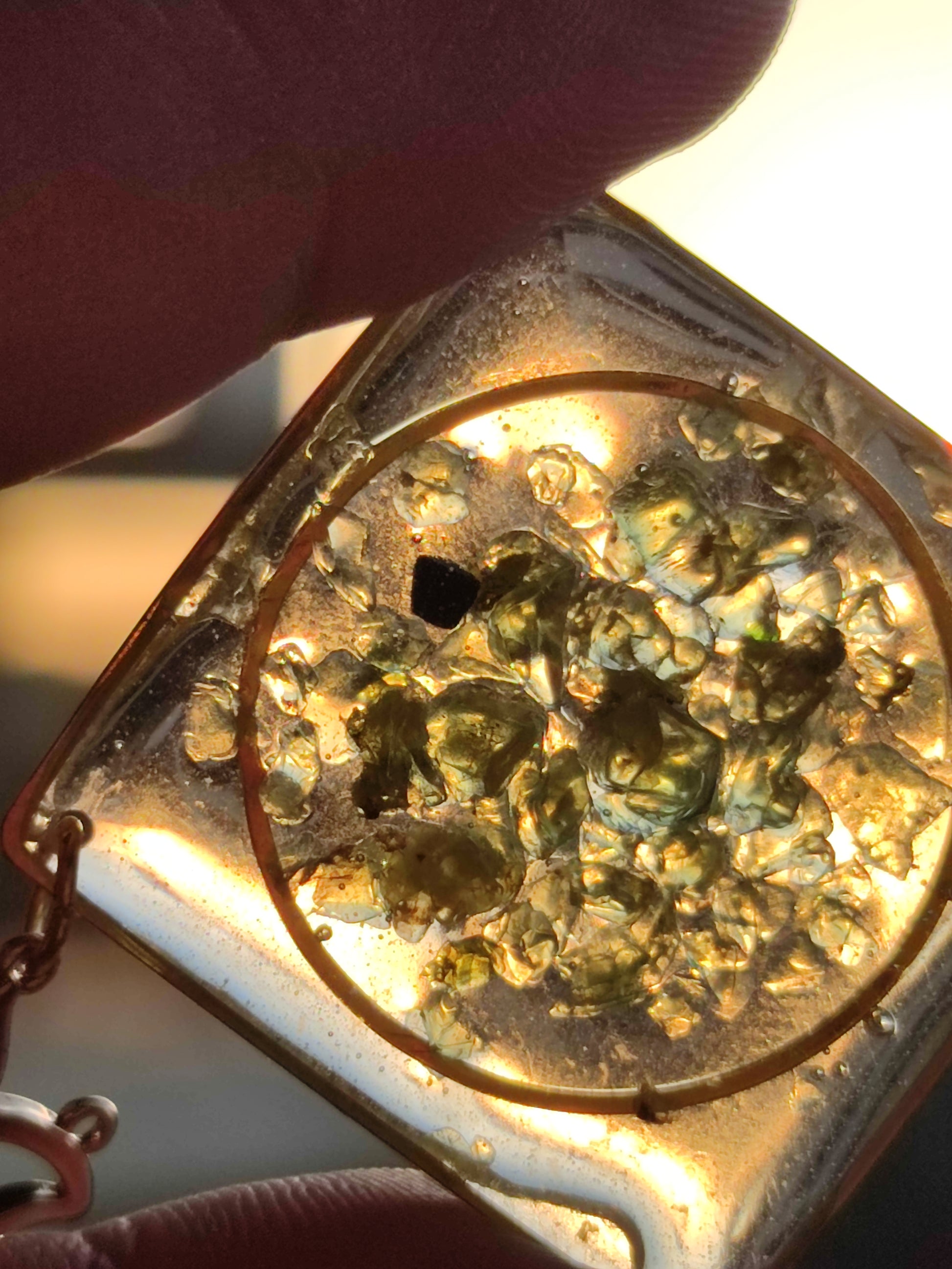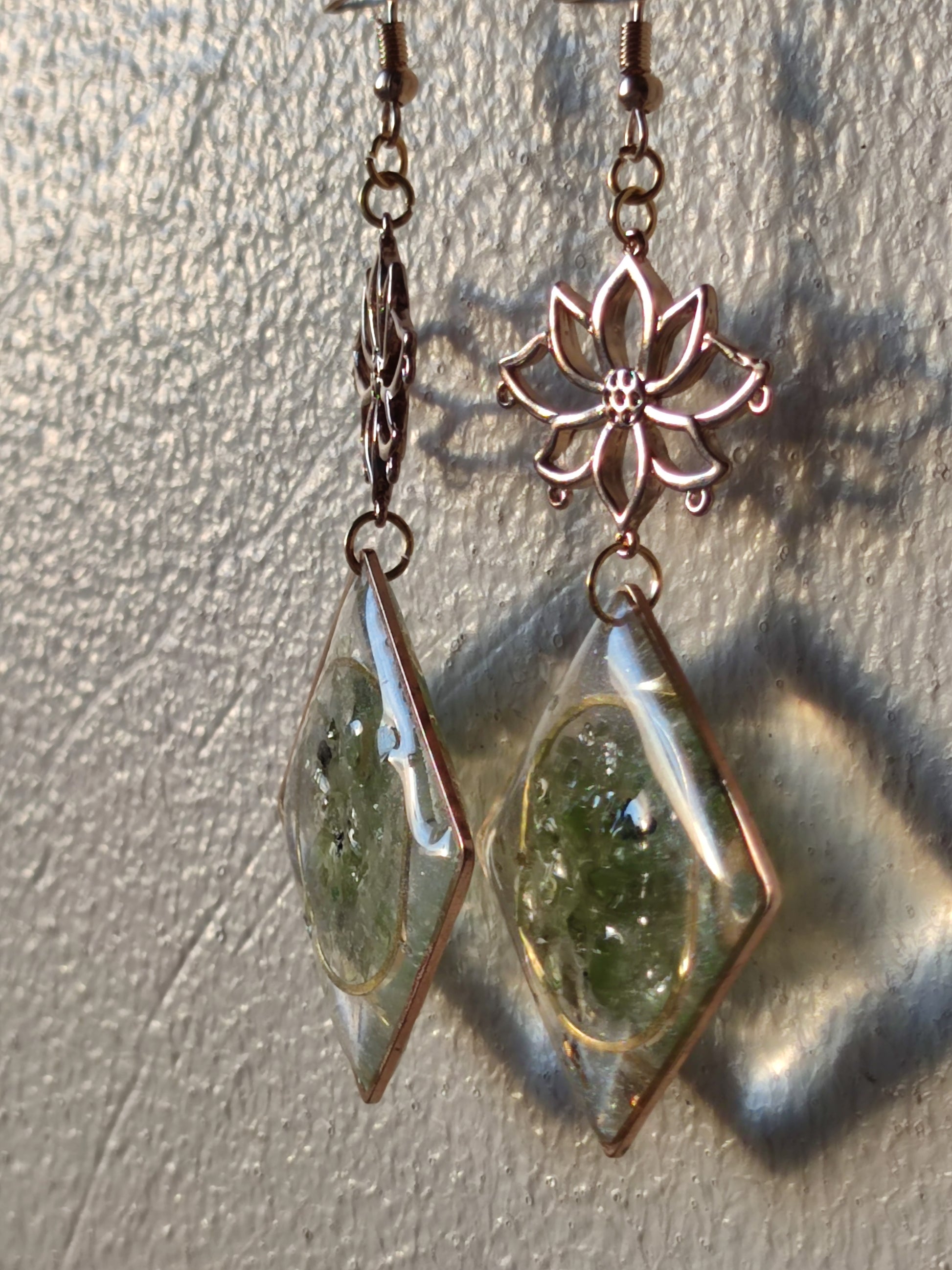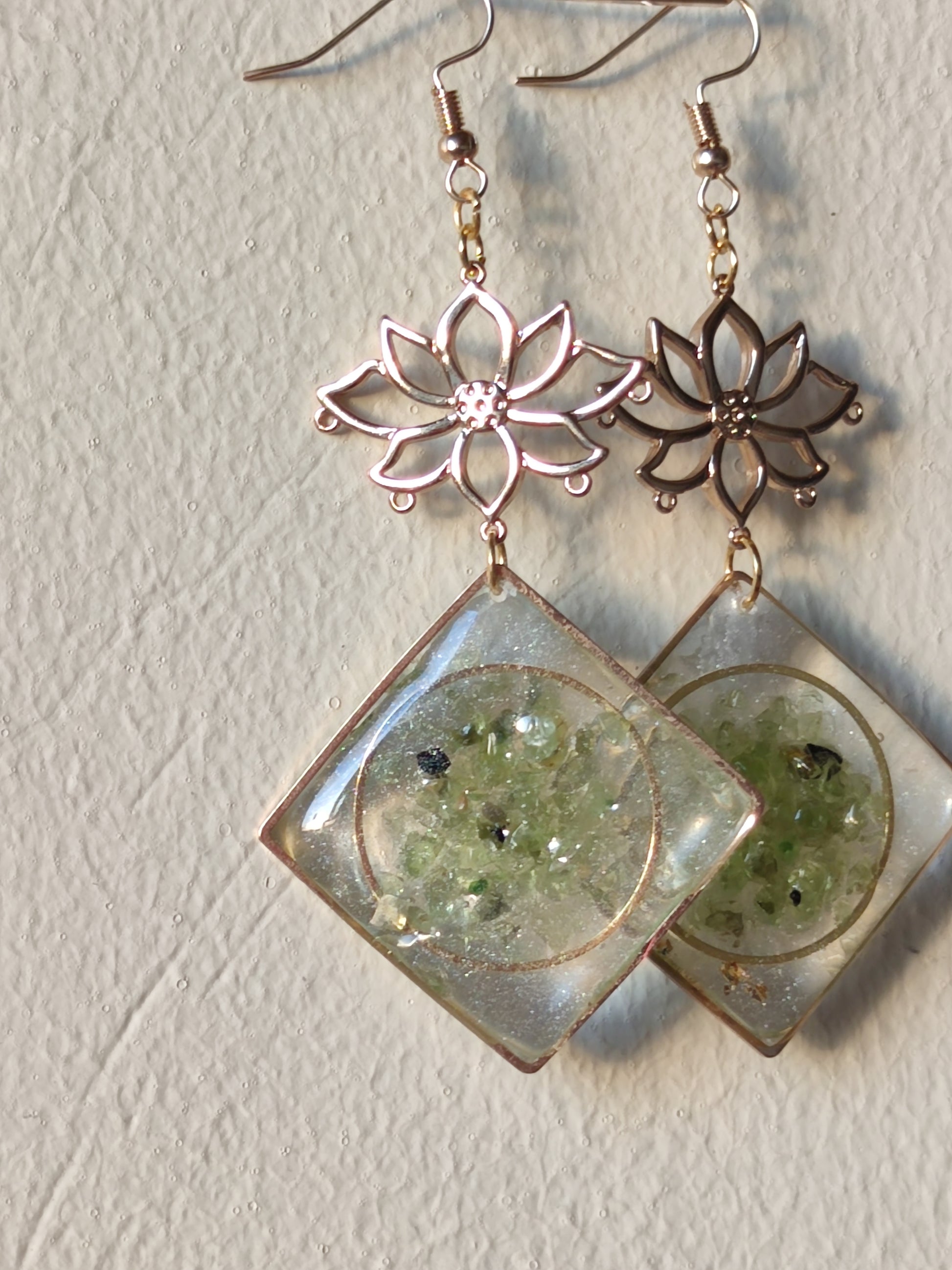 Earrings have anti tarnish hooks and charms and they are lightweight including peridot crystals chips encased in resin