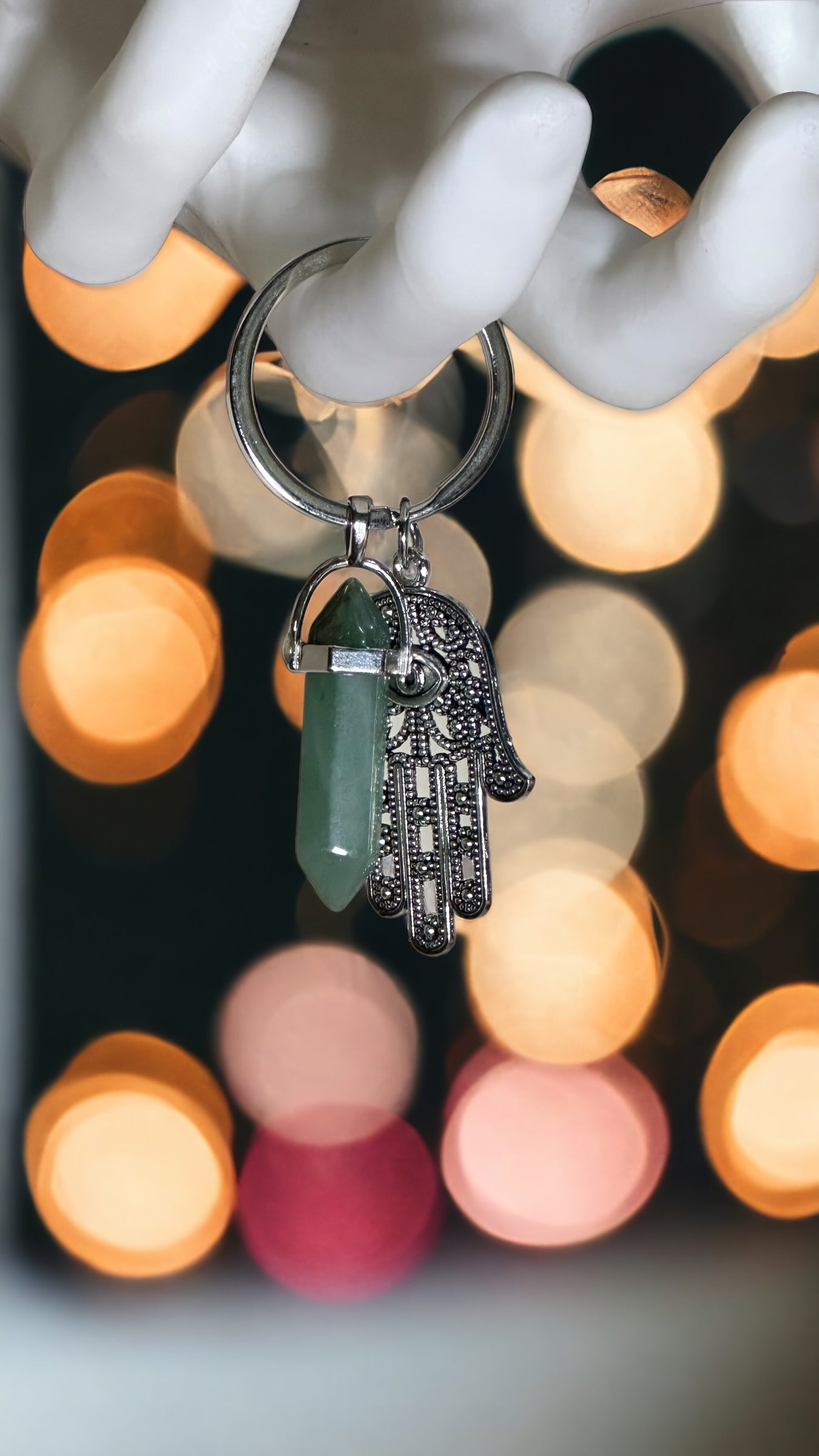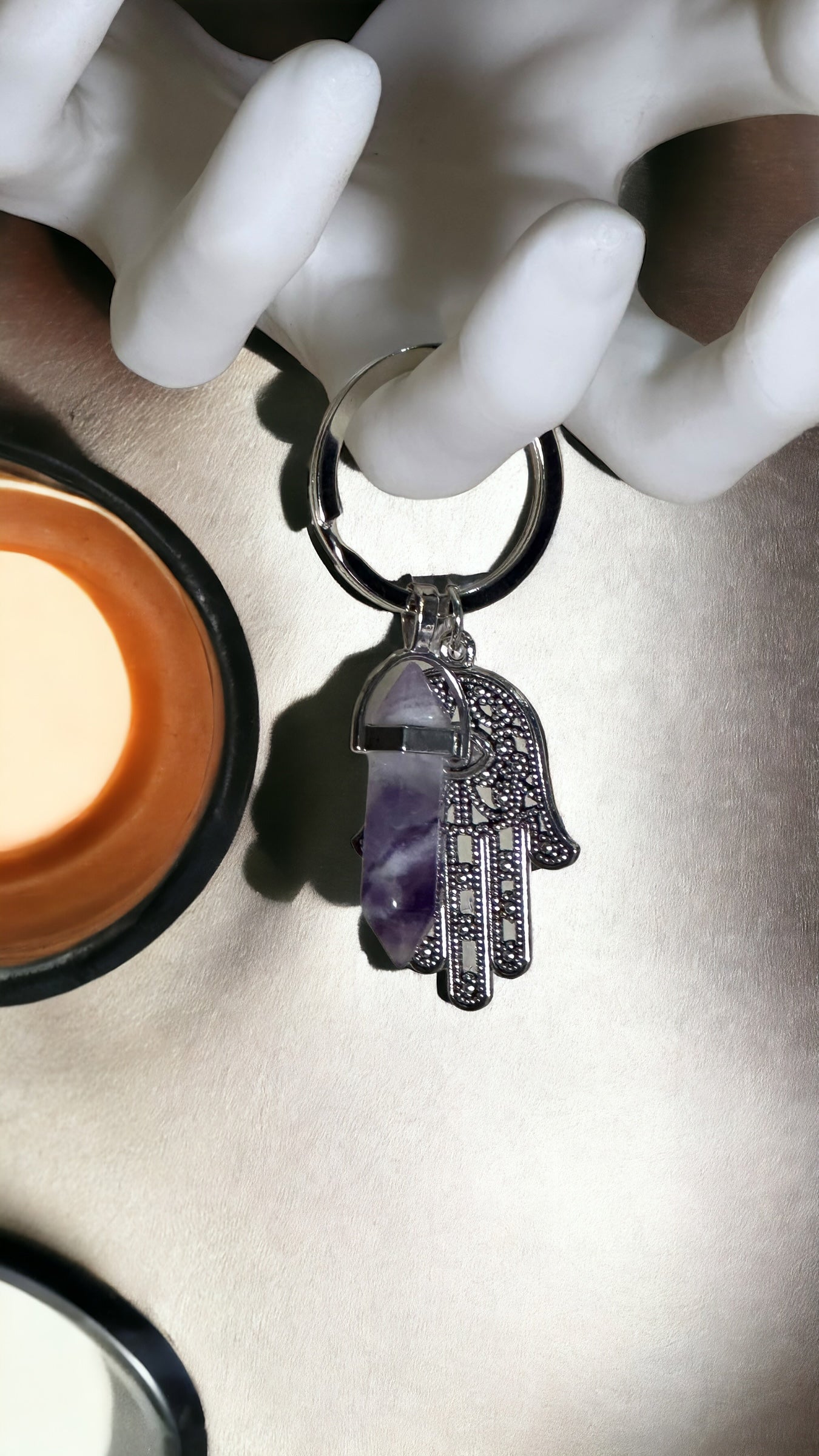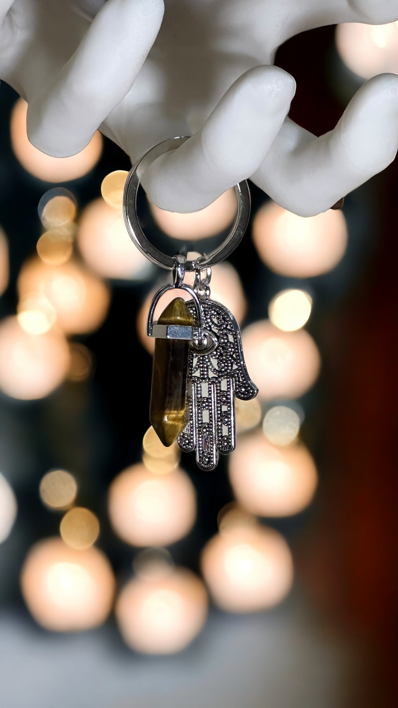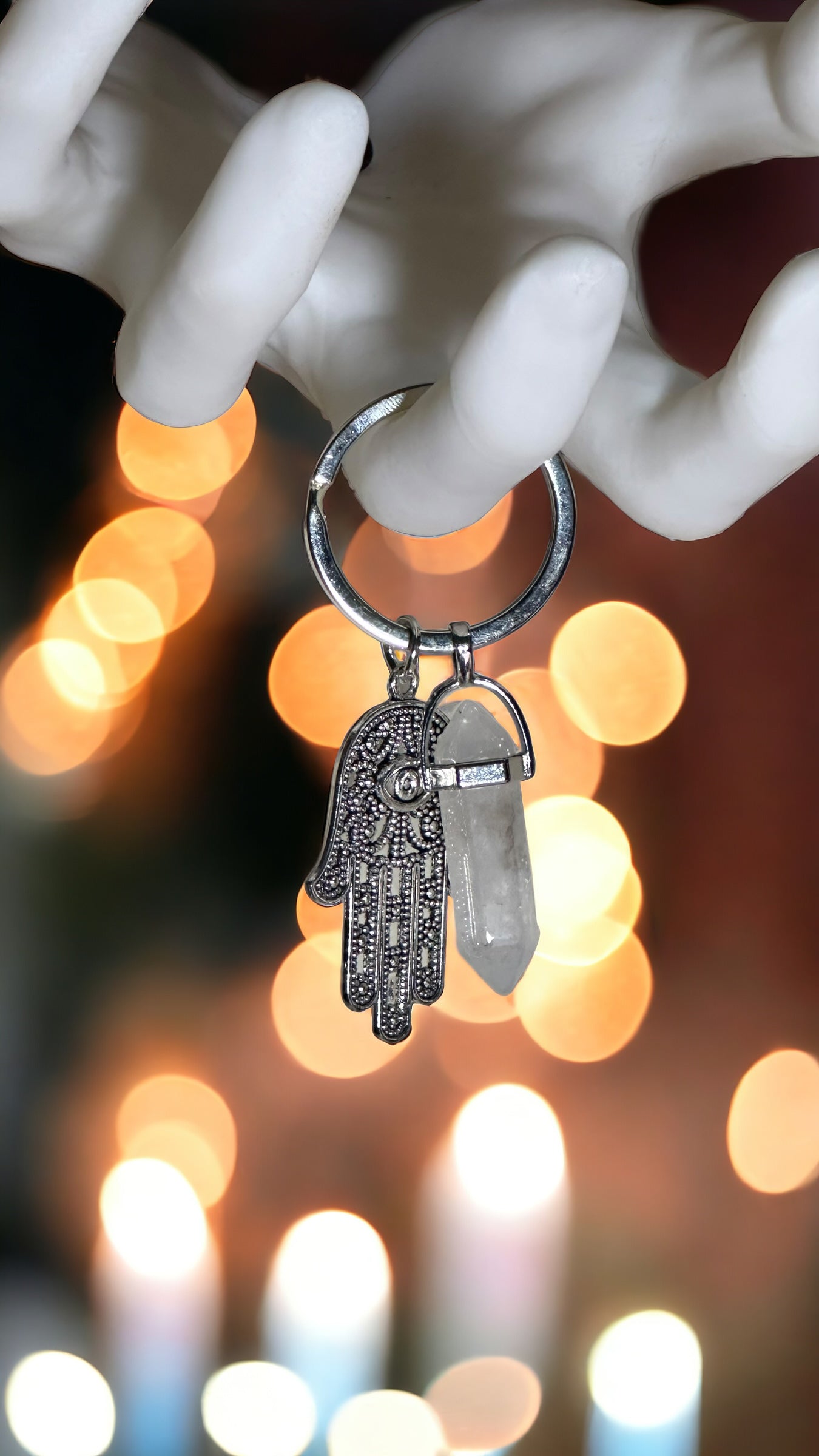 Safeguard your energy with our Evil Eye Protection Keychain. Adorned with real crystal points and a hamsa hand, a powerful symbol of protection and strength. Carry a touch of luxury and ward off negativity wherever you go.