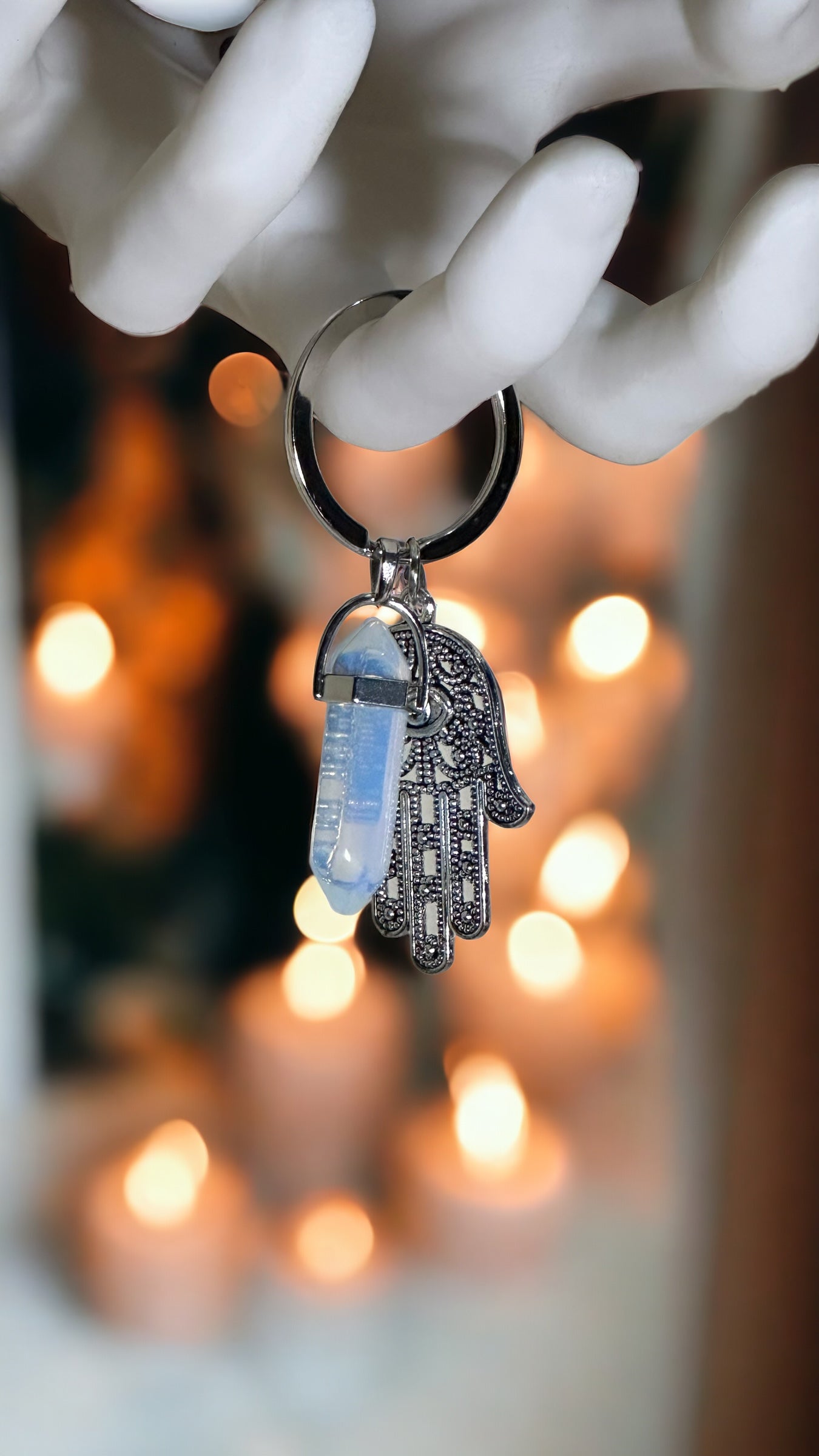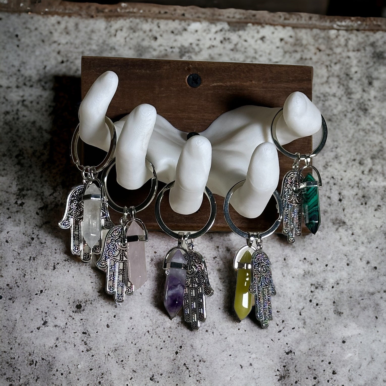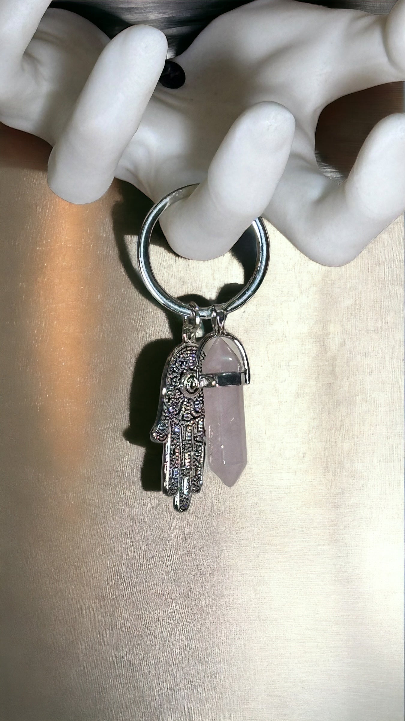 Safeguard your energy with our Evil Eye Protection Keychain. Adorned with real crystal points and a hamsa hand, a powerful symbol of protection and strength. Carry a touch of luxury and ward off negativity wherever you go.