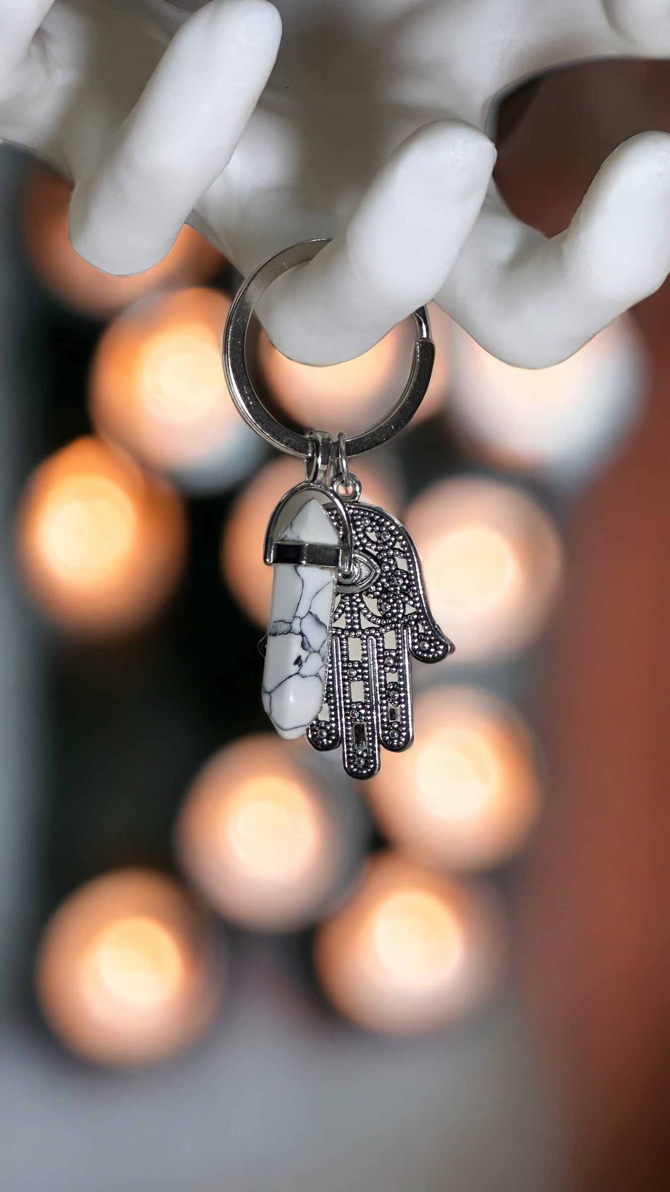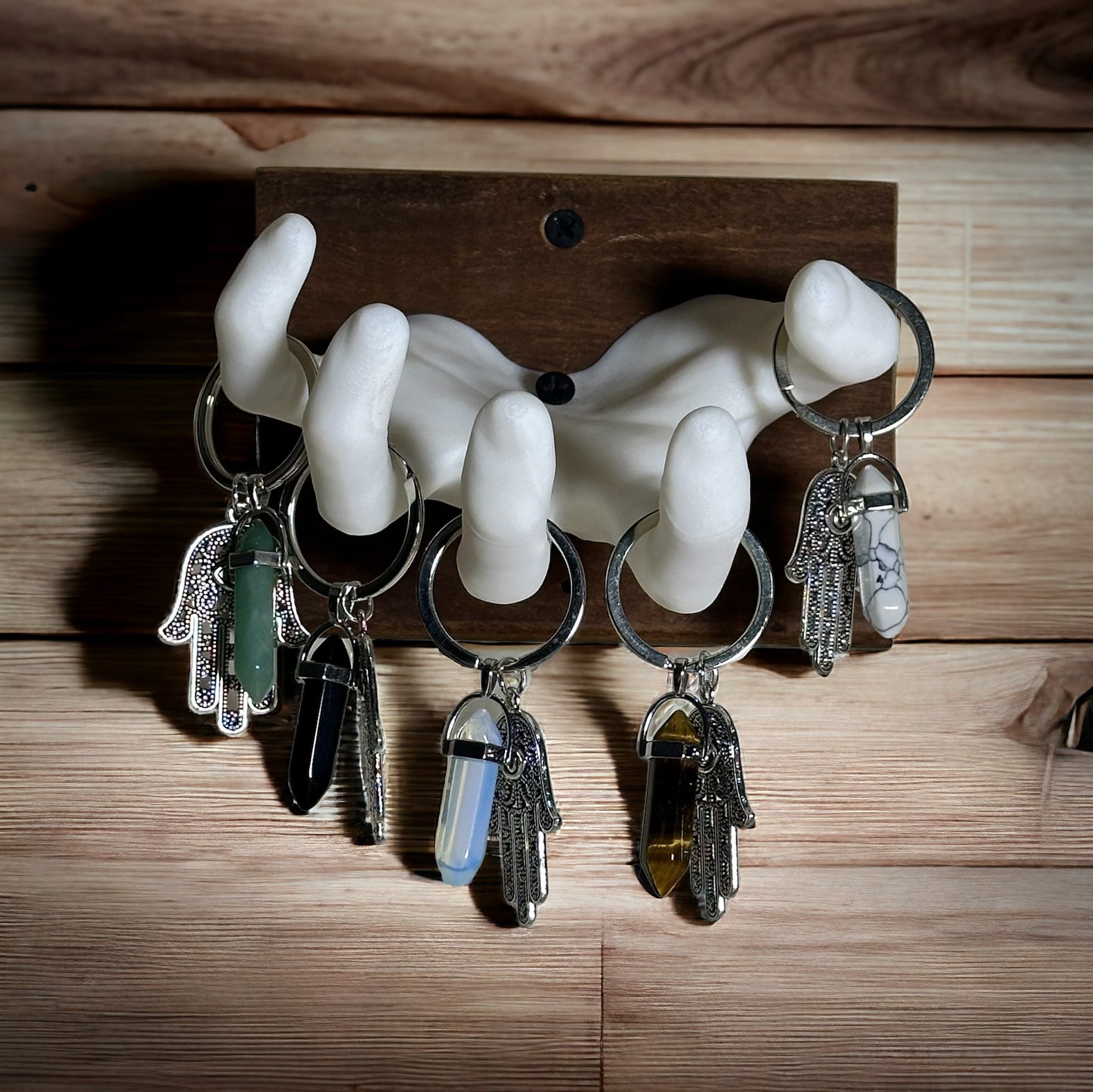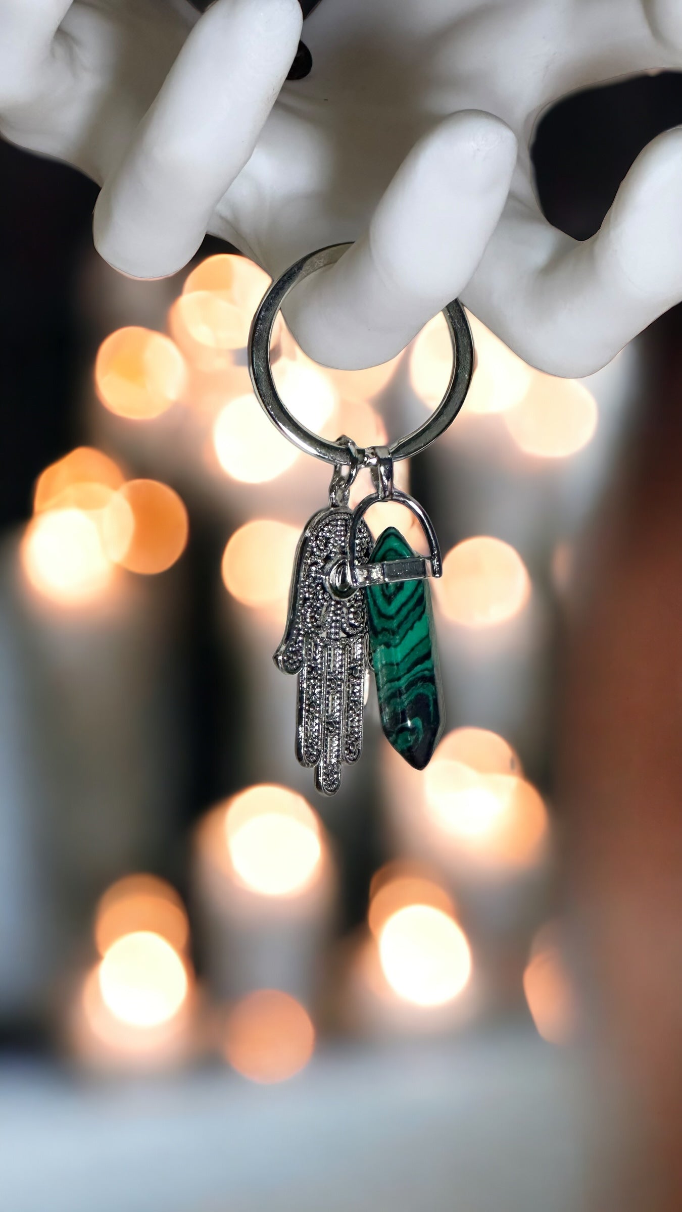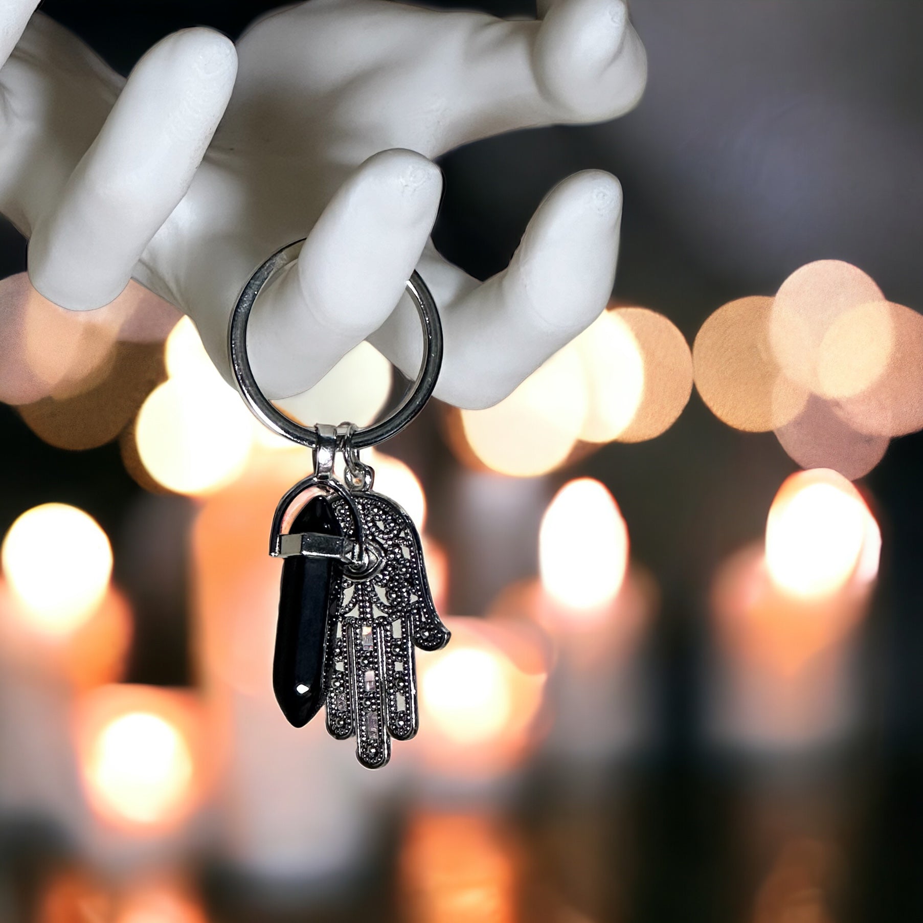 Safeguard your energy with our Evil Eye Protection Keychain. Adorned with real crystal points and a hamsa hand, a powerful symbol of protection and strength. Carry a touch of luxury and ward off negativity wherever you go.