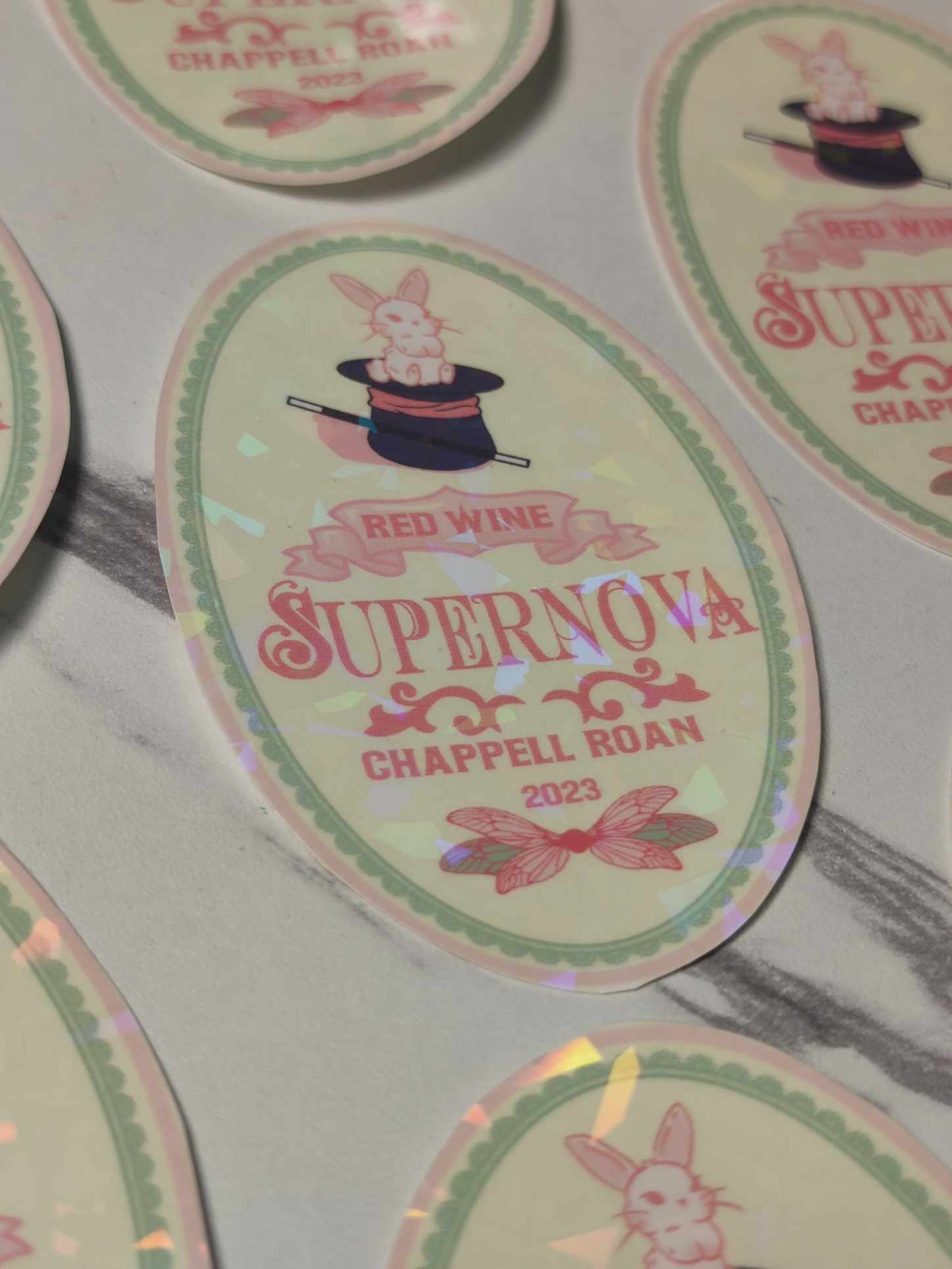 This sticker is crafted to resemble an elegant wine label with a cosmic twist, inspired by Chappell Roan's unique aesthetic. T The label features the text "Red Wine Supernova" in a sophisticated, flowing script, evoking a sense of both refinement and celestial wonder. Surrounding the text are subtle illustrations of the magical elements such as the hat and the rabbit, creating a dreamy, otherworldly atmosphere. The edges of the sticker are slightly ornate, resembling the intricate borders of vintage wine labels. This waterproof sticker is perfect for adding a touch of cosmic elegance to water bottles, notebooks, or any surface you choose.