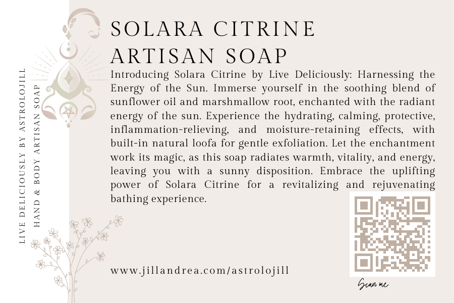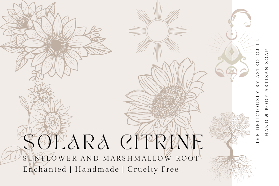 Introducing Solara Citrine by Live Deliciously: Harnessing the Energy of the Sun. Immerse yourself in the soothing blend of sunflower oil and marshmallow root, enchanted with the radiant energy of the sun. Experience the hydrating, calming, protective, inflammation-relieving, and moisture-retaining effects. Let the enchantment work its magic, as this soap radiates warmth, vitality, and energy, leaving you with a sunny disposition as well as a magnet to riches. Embrace the uplifting power of Solara Citrine for a revitalizing and rejuvenating bathing experience.