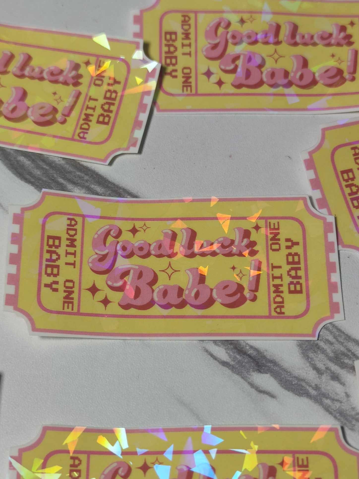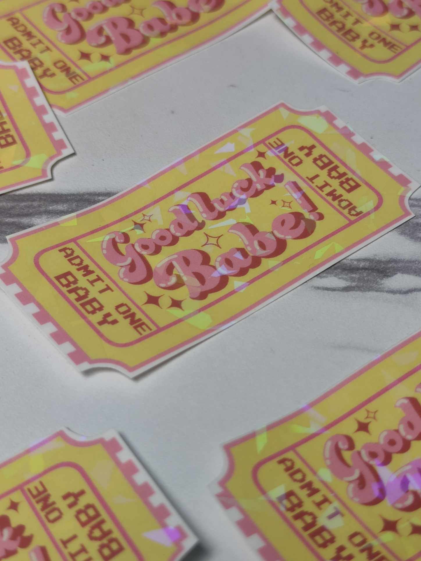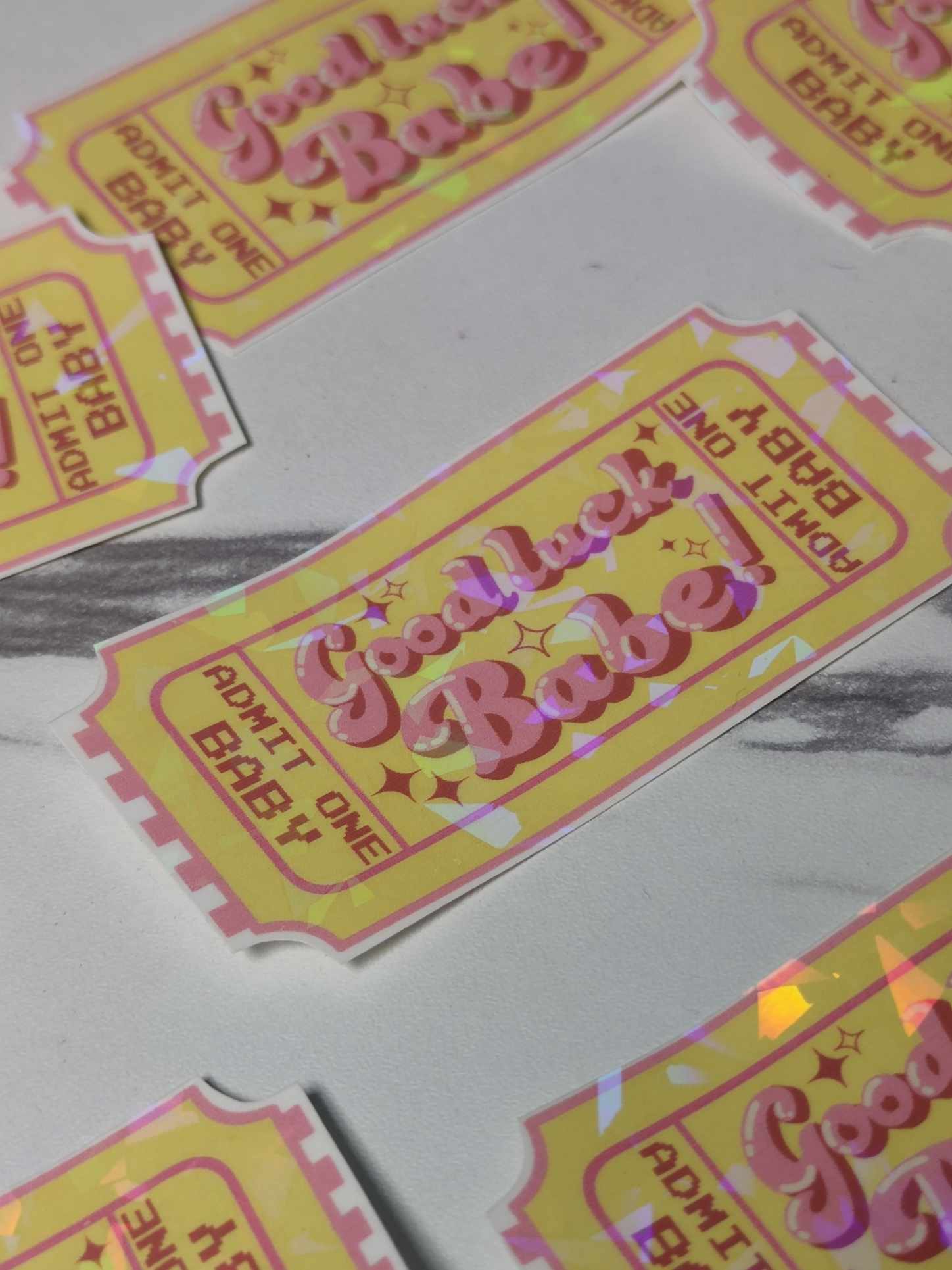 This sticker is designed to resemble a vintage movie ticket, inspired by the style and aesthetic of Chappell Roan. The ticket is a soft pastel pink, with subtle glittery accents that give it a glamorous, retro vibe. The words "Good Luck Babe" are prominently displayed in a bold, elegant font, reminiscent of old Hollywood marquees. Below the text, there are small decorative elements like stars and hearts, adding a touch of whimsy. The edges of the ticket are slightly perforated, mimicking the look of a real ticket stub. The design is waterproof, making it perfect for decorating water bottles, laptops, or any other surface, while carrying a message of positivity and charm.